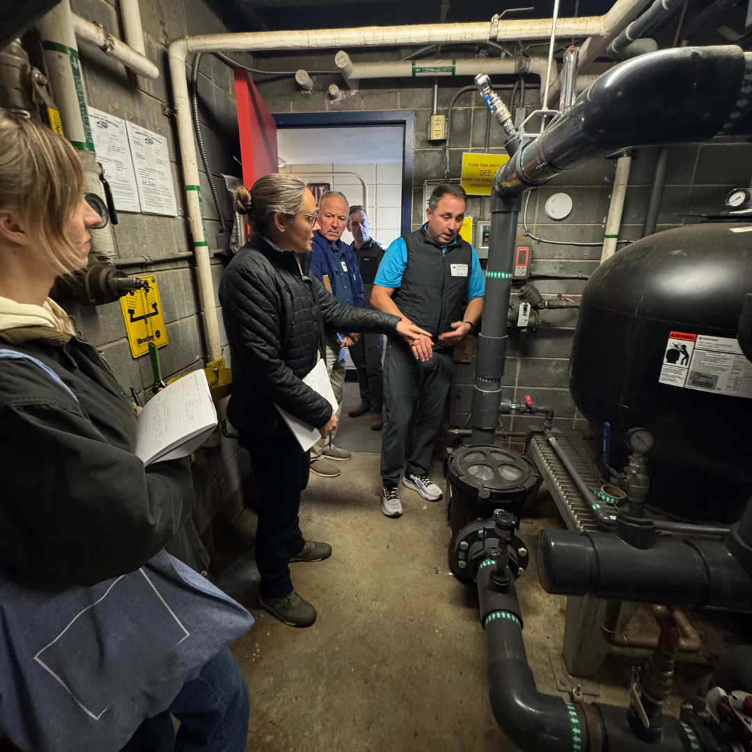 (group of engineers inside the pool pump room looking at the YWCA of Asheville pool filters)